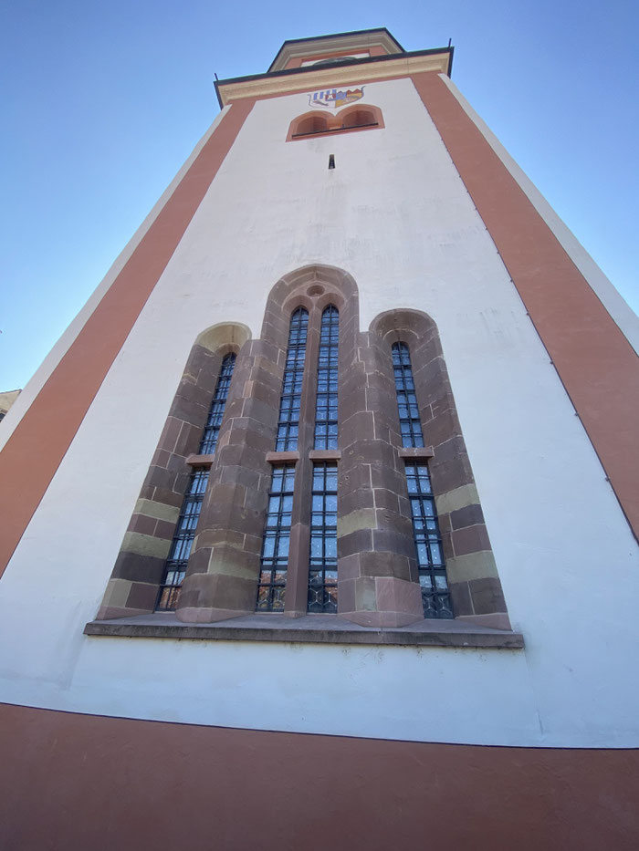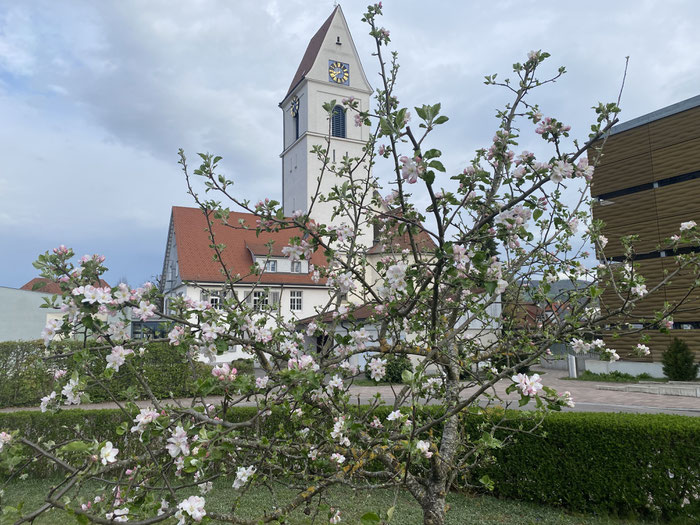 Kirschbaumblüte vor der Herz Jesu Kirche in Unterlauchringen - immer ein schöner Ausblick von unserem Haus aus.